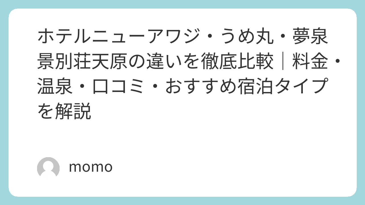 ここでは、「ホテルニューアワジ」「うめ丸」「夢泉景別荘 天原」を料金・立地・設備・口コミなどの観点からわかりやすく比較します。